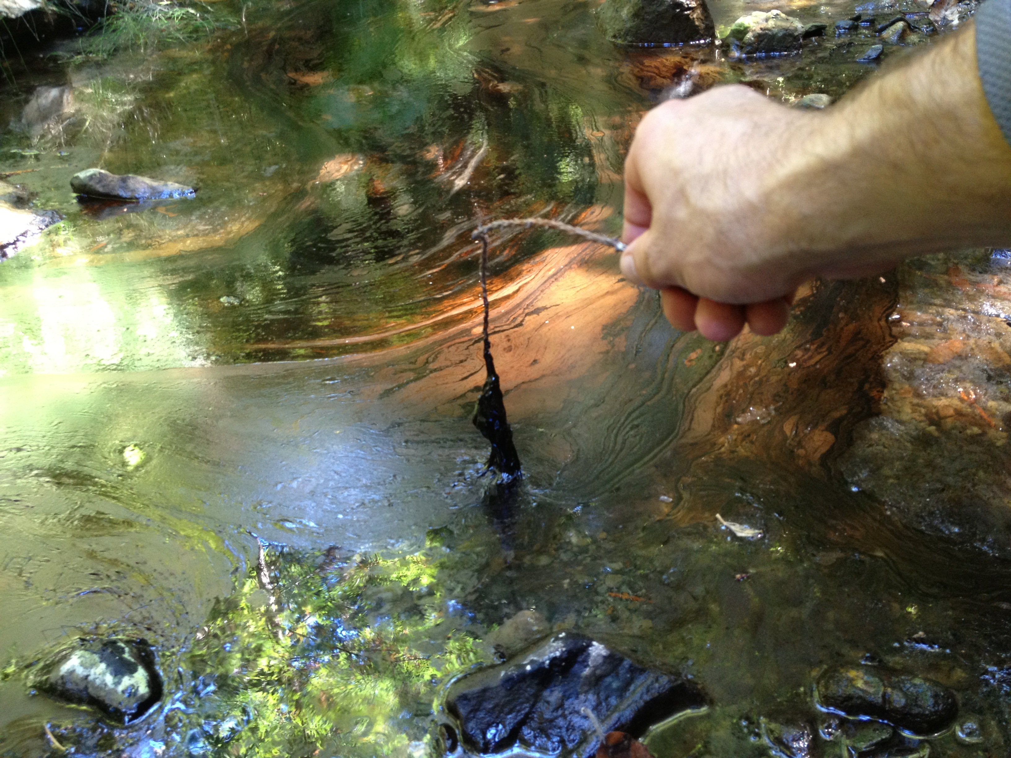 The primary spot on Tarwater creek consists of a pool of tar, within some old river rocks. Poking a stick in it, it seems to be a few inches deep and about 2 foot diameter. This thick tar slooowwwly makes it’s way down the creek, which is flowing quite slowly this time of year. We maybe saw 2 or 3 gallons in all, with a very distinctive smell on an ~85F degree day.