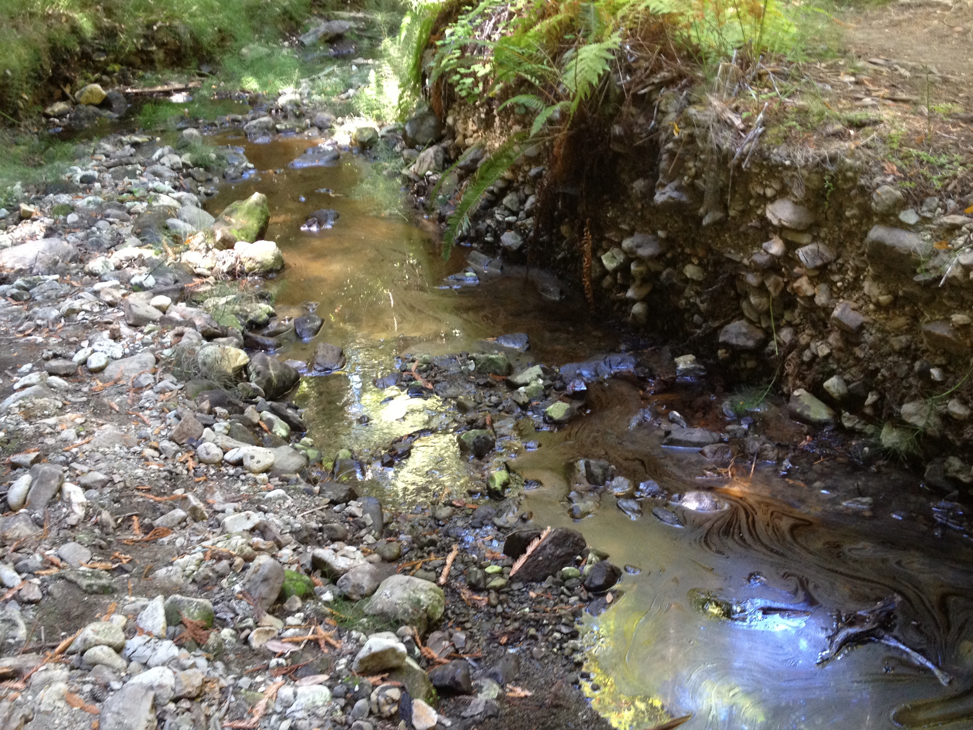 “Pescadero Creek Park sits atop a deposit of natural gas and oil. Natural gas occasionally bubbles up through seams near Hoffman Creek producing a strong gas odor. Crude oil pools up in the channel of Tarwater Creek, and seeps into Jones Gulch Creek staining the rocks. Oil exploration was attempted in the 1970’s but failed to hit the pool. Natural gas under San Mateo County has been estimated at 10 billion cubic feet but no exploration wells have been attempted in the park.”