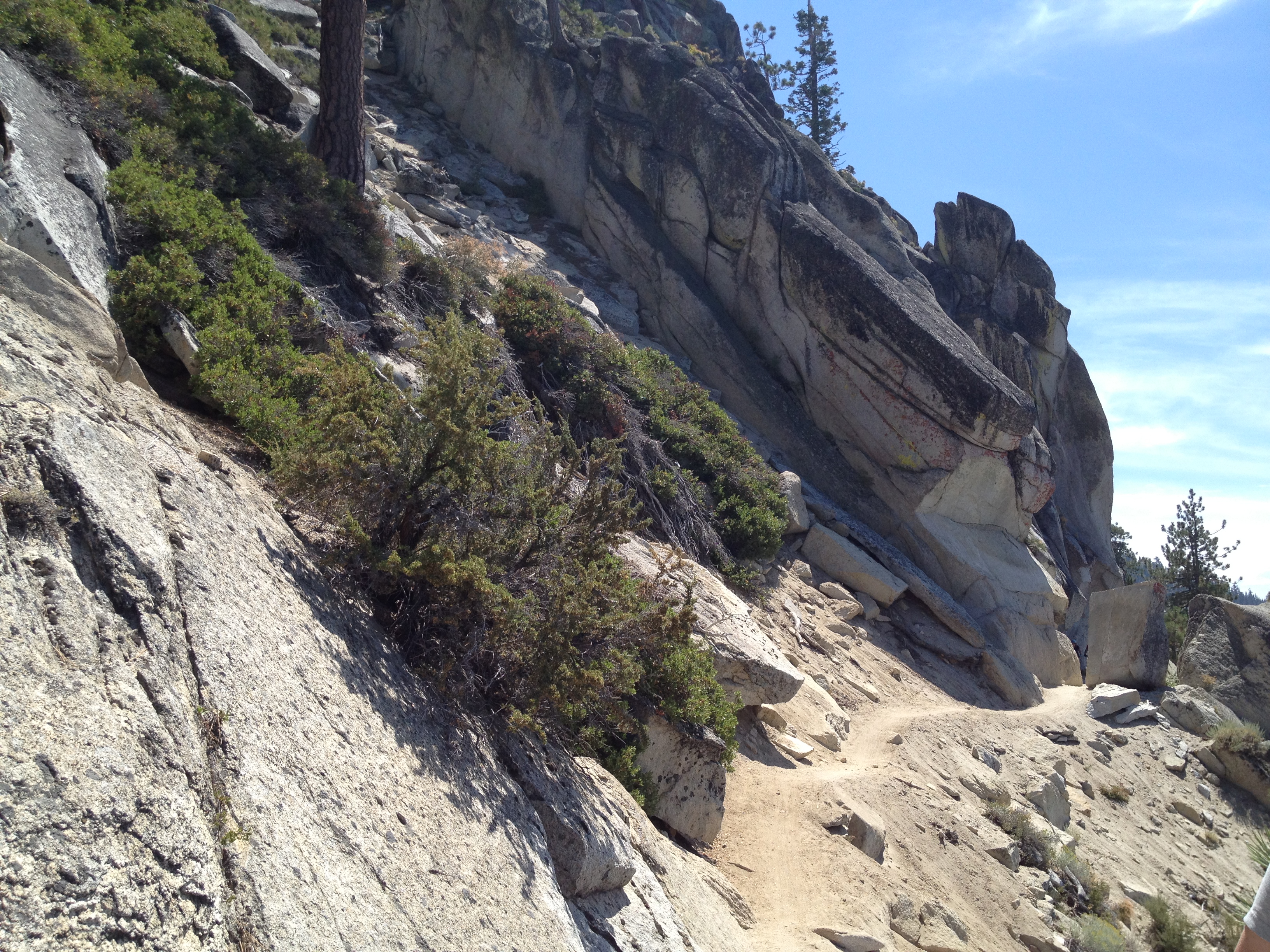 It was carved out of the edge of the mountain overlooking Lake Tahoe. It’s not a place for those afraid of heights or any balance issues. The trail is quite narrow in spots, and you would tumble VERY far if you left the trail.