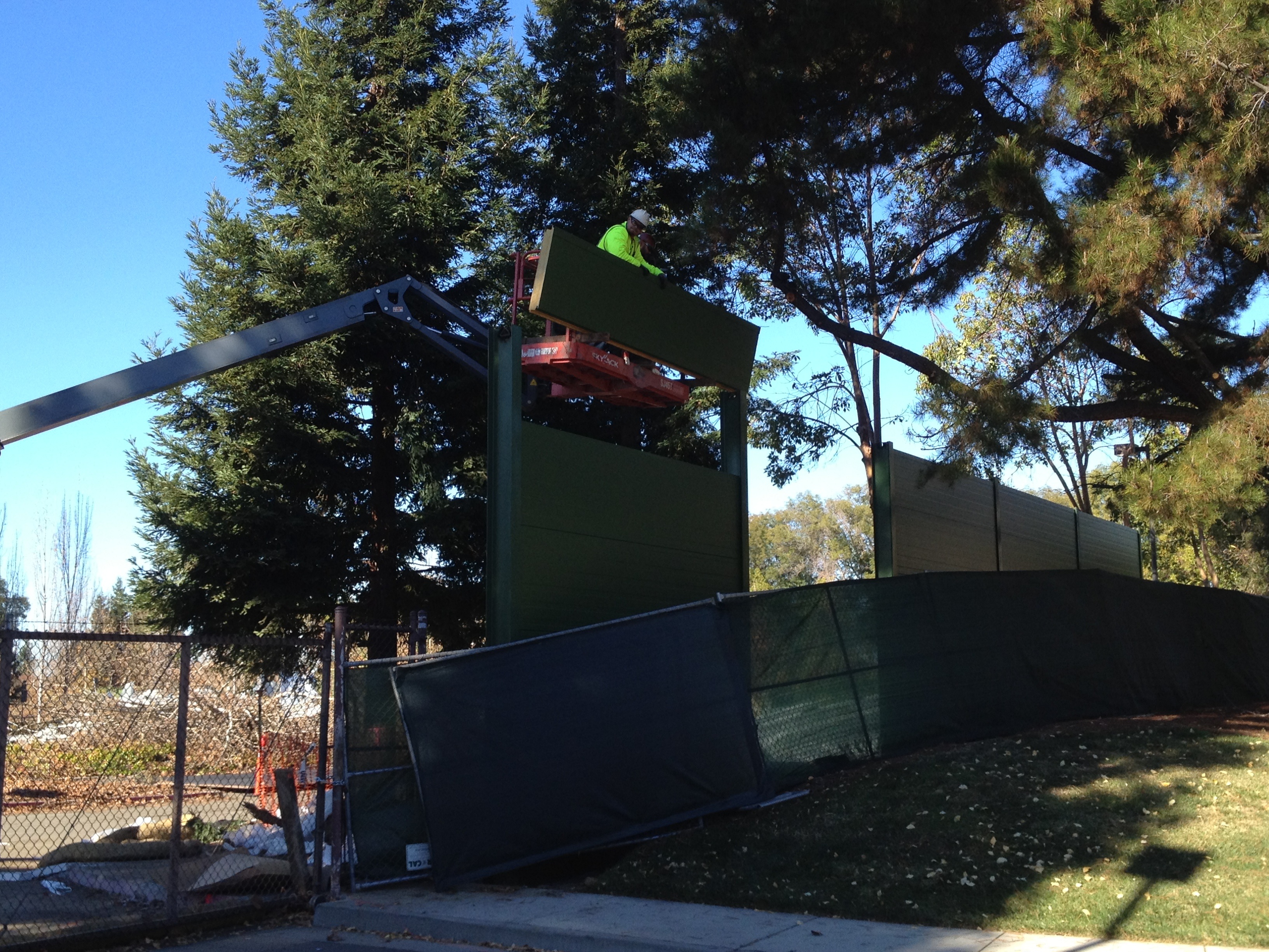 Recently I noticed they were not just doing chain link fence, but erecting a huge ~20 foot perimeter wall. This wall is not permanent, but close to it! They’re driving posts deep into the ground and installing very heavy and thick wood panels. It will certainly prevent prying eyes and any possibility of trespassers climbing over the slick facade. “Now is the time” I thought, to take some pictures, as the only other way to see this landmark building under construction is to get a construction job or buy a drone!