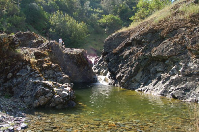 This is the place called “Hole in the Rock”, which is a seasonal (remote) swimming hole. It has a stepped drop of about 20 feet, dropping into a pool that is normally quite large and at least 8 feet deep.