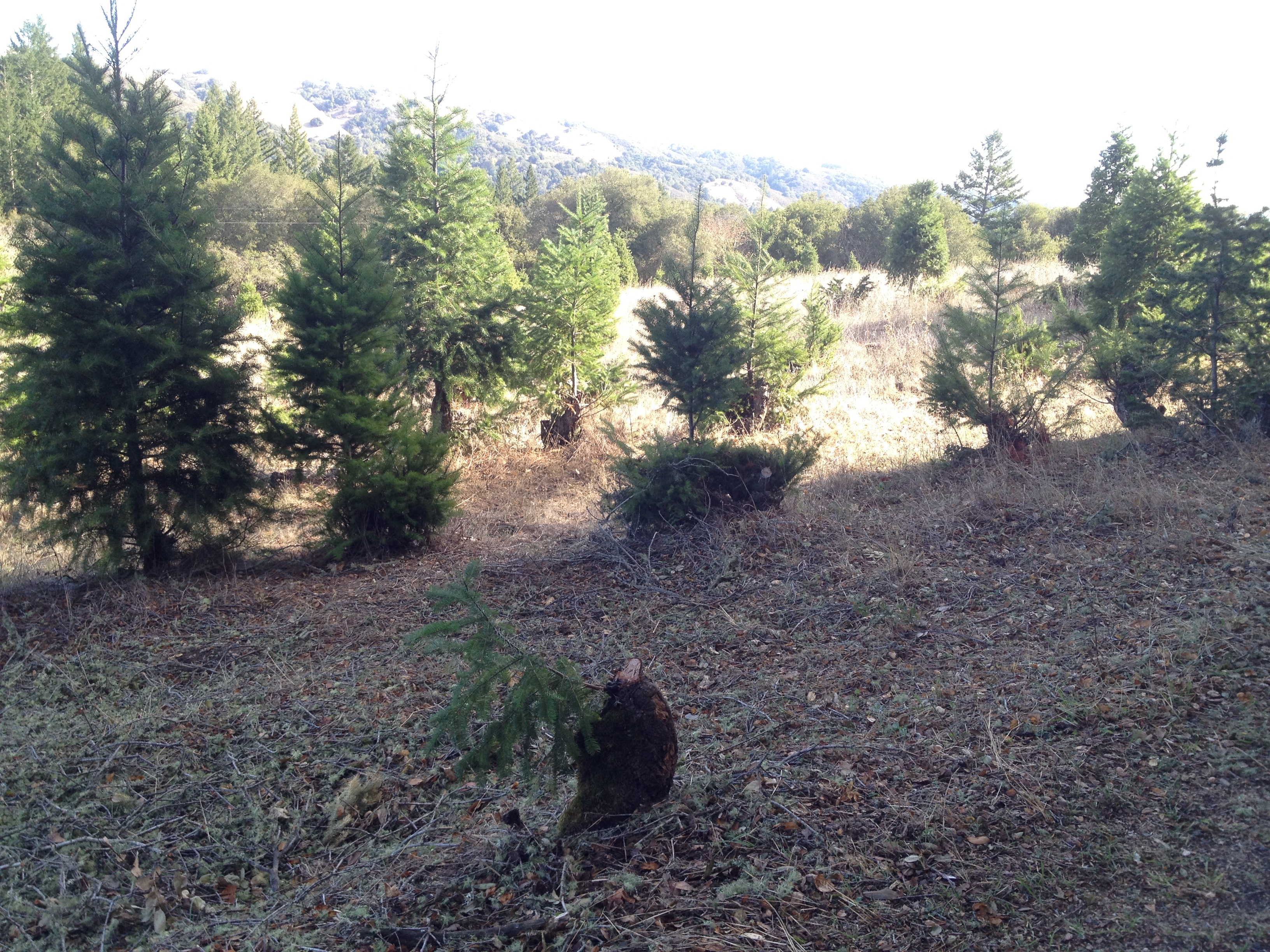 A view of some of the Christmas Trees, and a stump in the foreground that’s making a comeback!