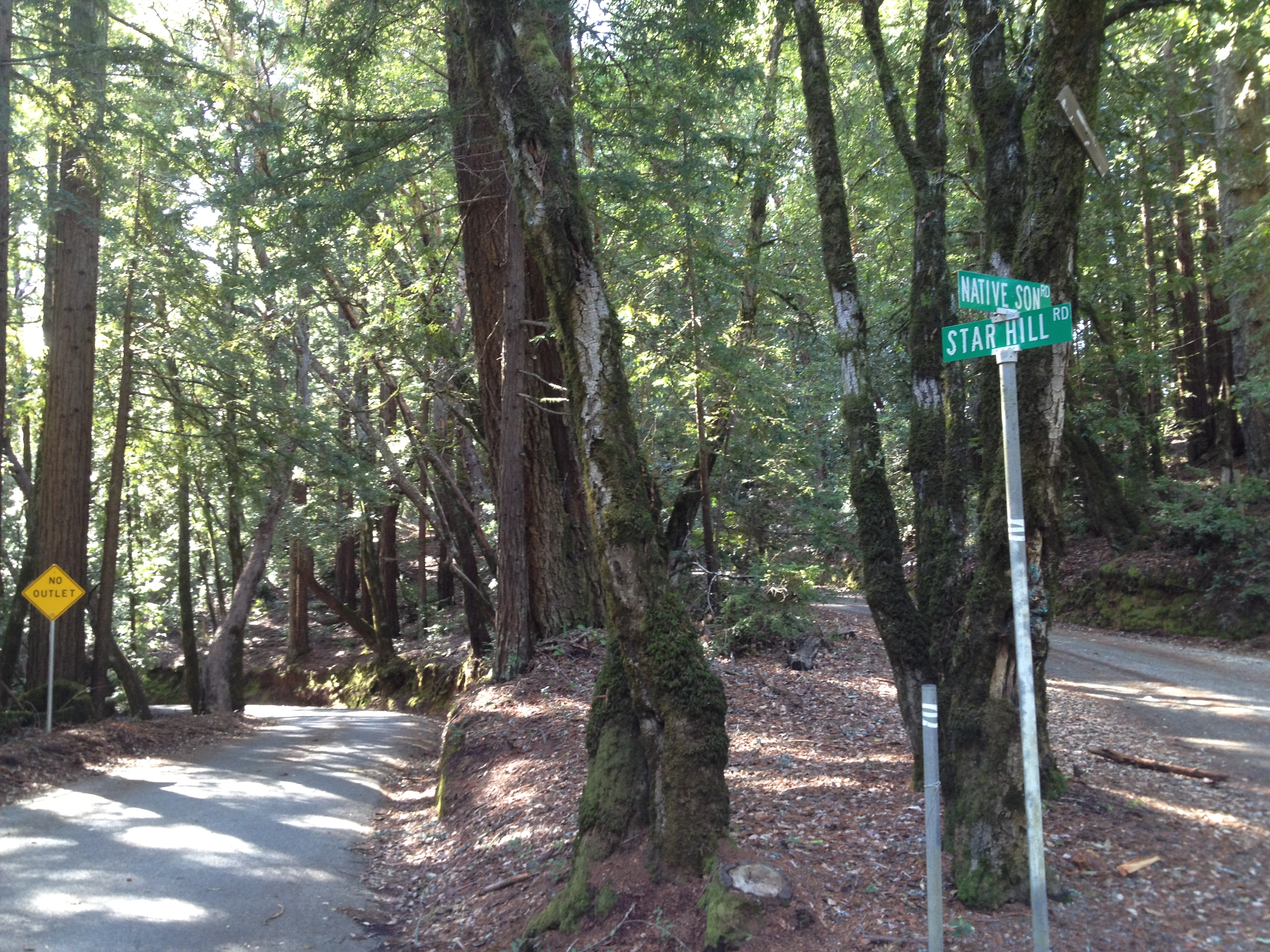 Two of these roads are on one side of El Corte de Madera, and one is on the other side. All of them just “uphill” to the east of Neil Young’s 1000+ acre “Broken Arrow Ranch”…and golly gee there’s a cool 5 mile trail through the park’s wonderful redwood forest connecting one to the other. Off I went!