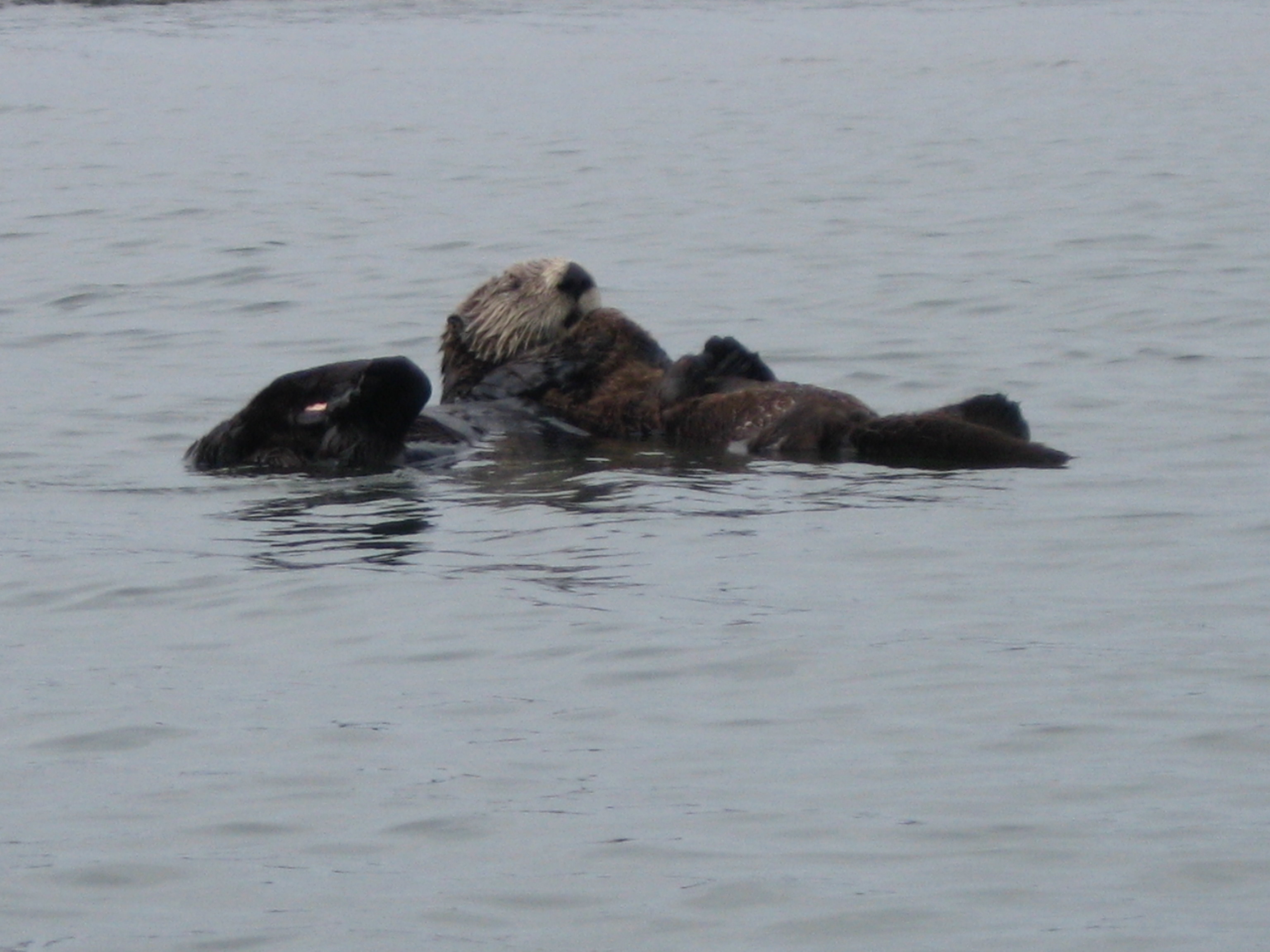 This is actually a pair of otters. The head you see belongs to the body on the left. It was hugging a smaller otter on the right (a large baby, perhaps?)