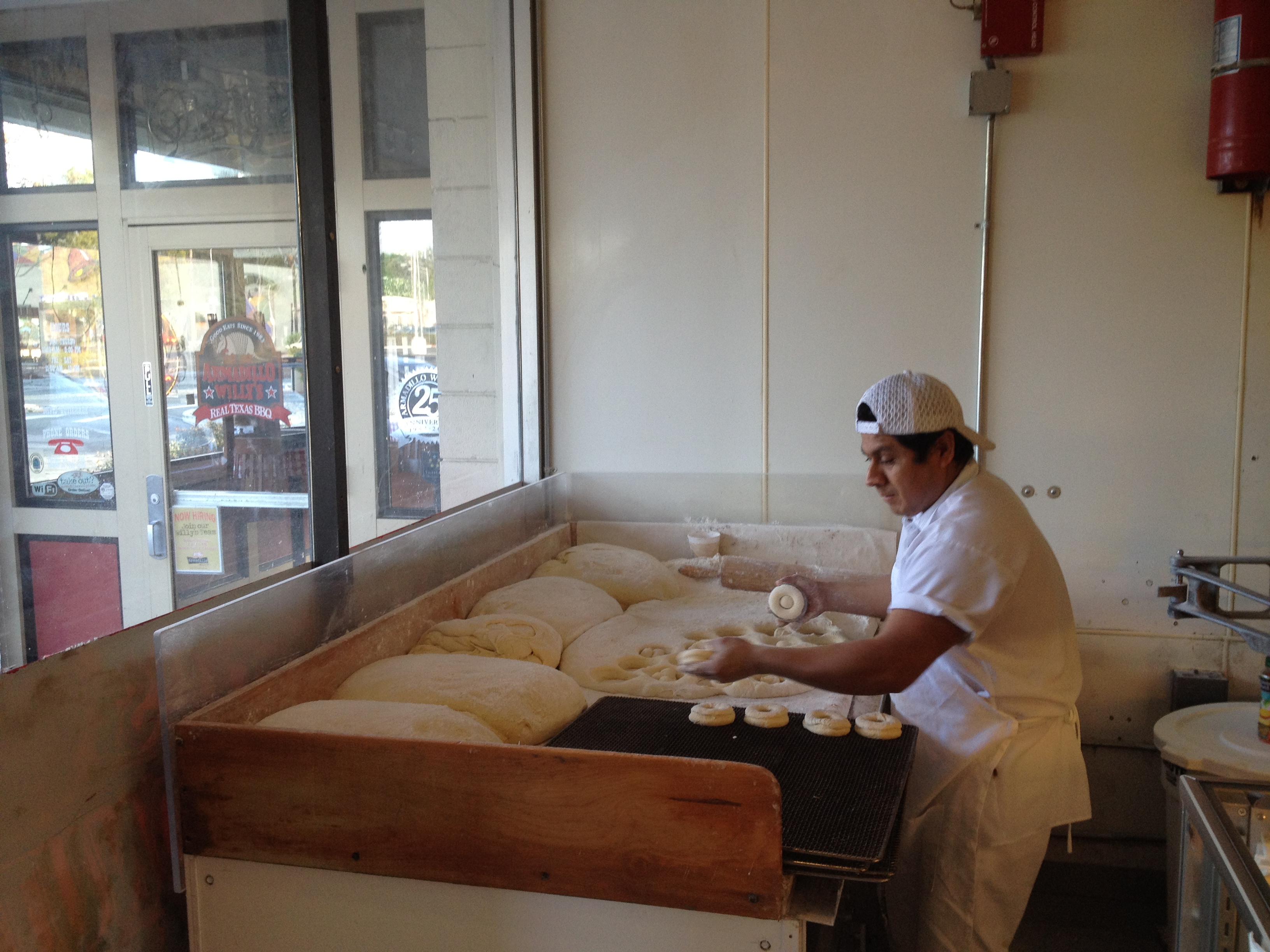 There are no machines and conveyor belts here. There are big tubs of dough, dumped on the floury table, which are then hand-rolled and cut before being manually lowered into the fryer…all in the front window for everyone to see!