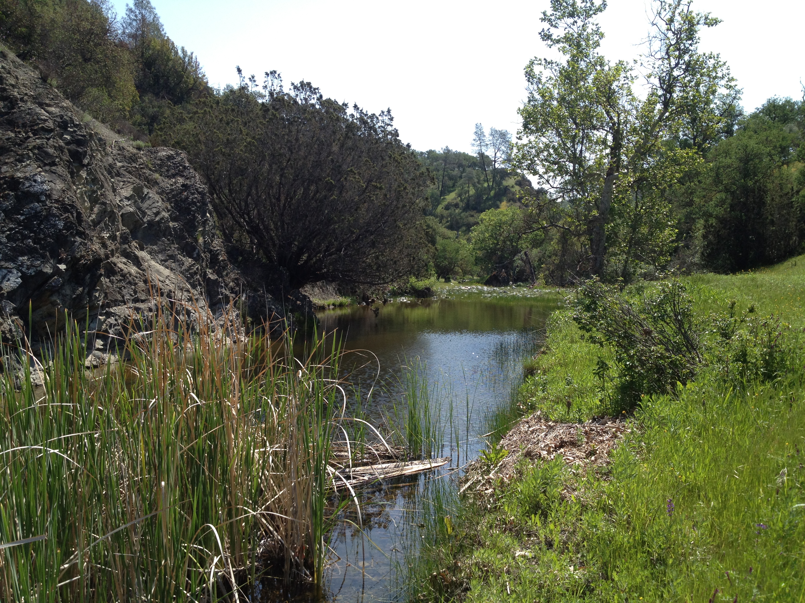 We walked along the creek trail, upstream towards Pacheco Crossing. We soon encountered the deepest pool of water along this trail. It appears to be year-round, with cattails, frogs, fish, and a pair of mallards that fled when they saw us.