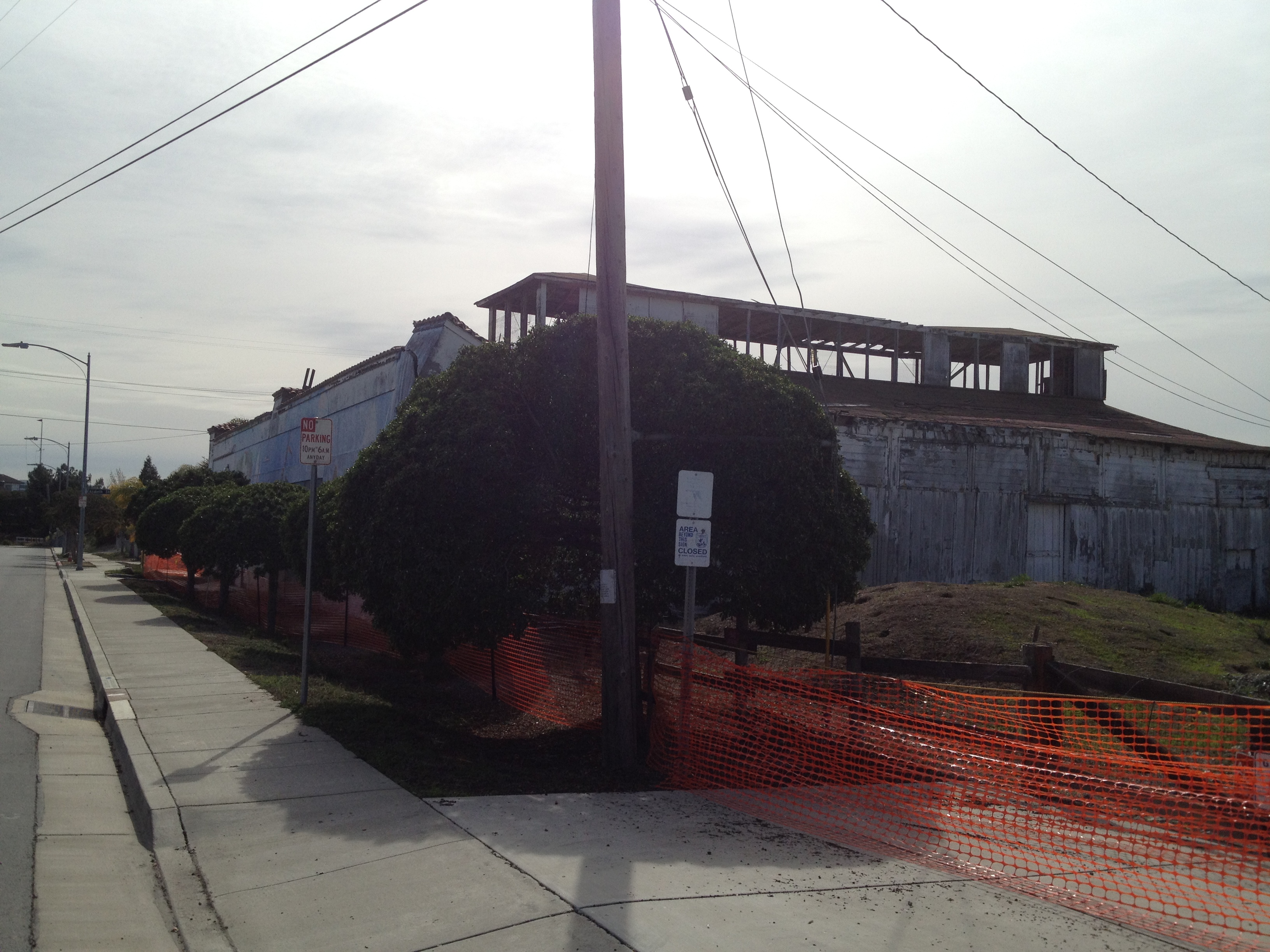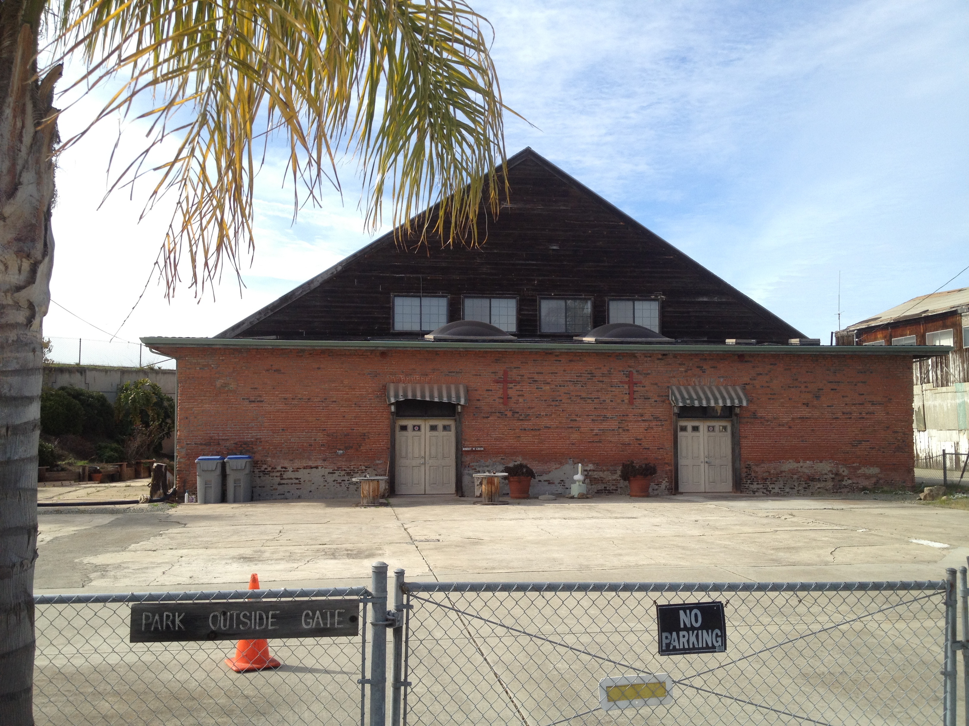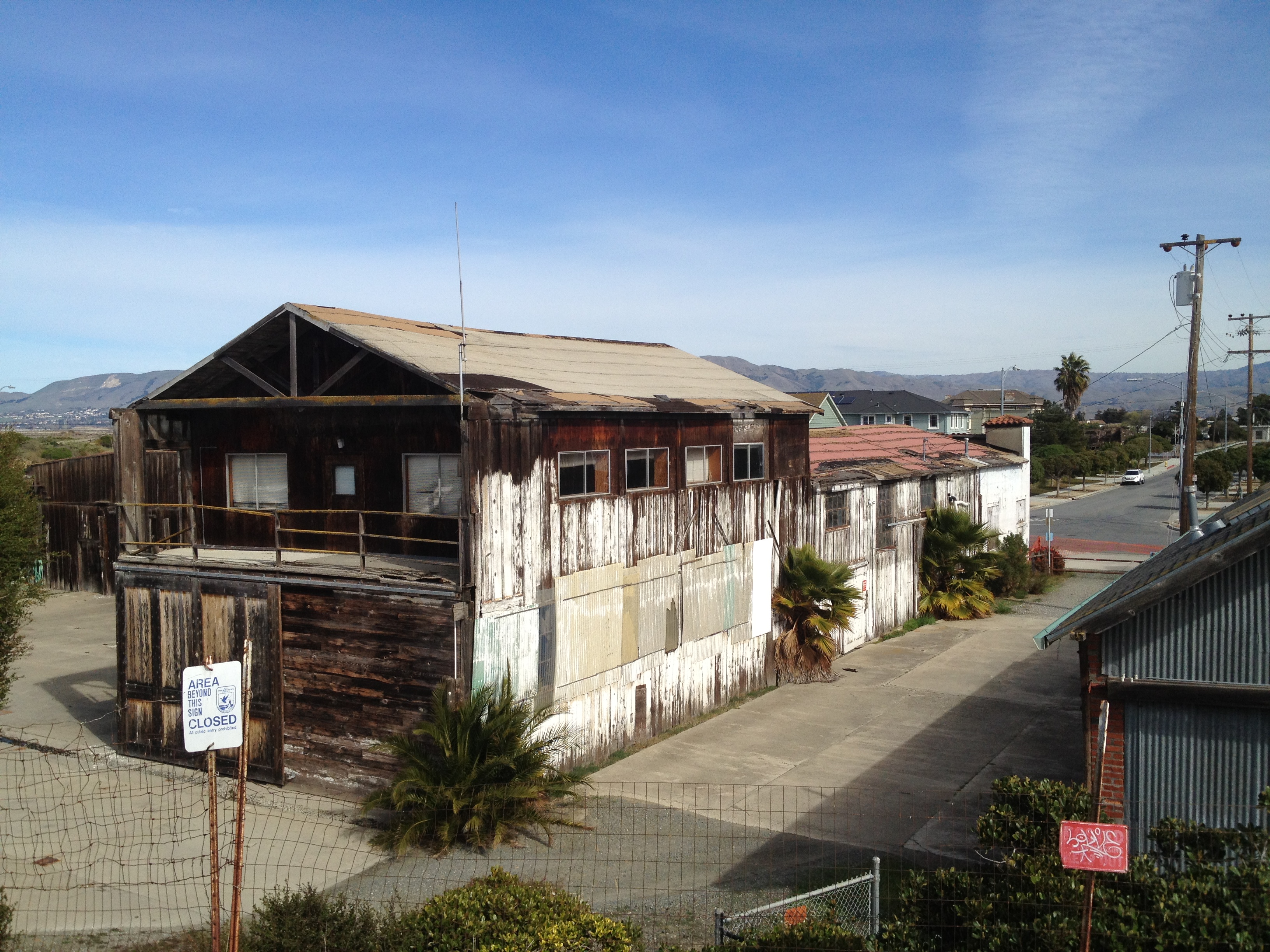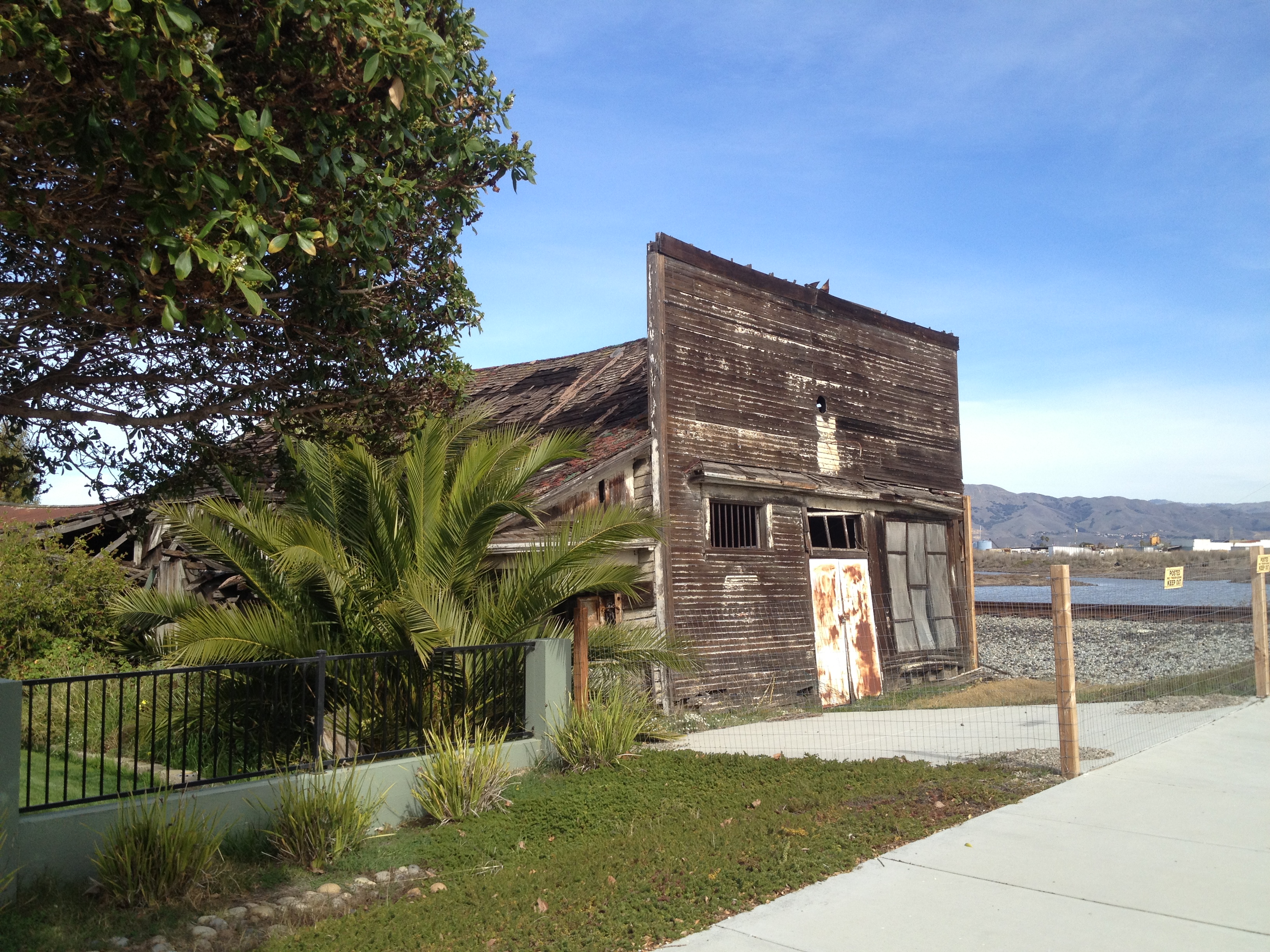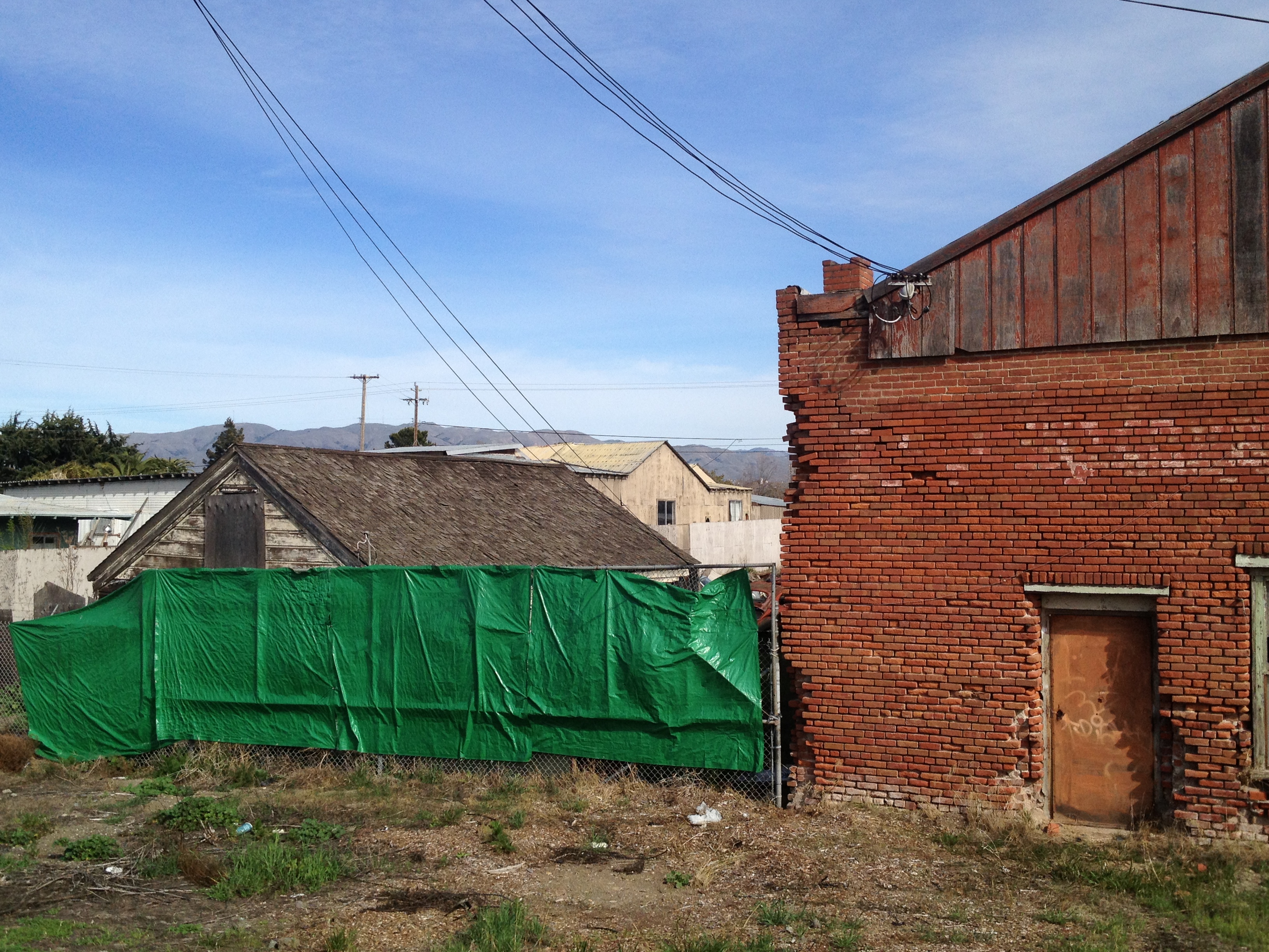Last, but not least, along the eastern edge of the tracks, a bit south of Vahls, lies the crumbling H.G. Wade warehouse and the neglected home next door. You may have already spotted the warehouse, depending which way you entered town. Several “Western” movies were said to have been partly filmed at this warehouse. (The house is behind the green tarp. It used to be more visible, including when Eric took photos: http://www.sanjose.com/underbelly/unbelly/Alviso/hornhouse.html )