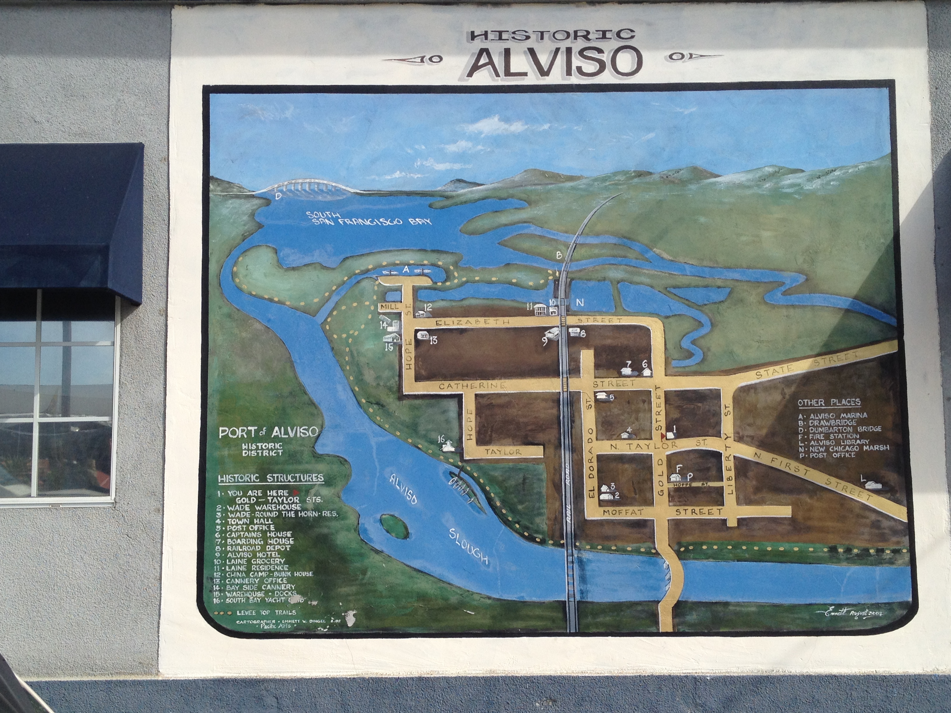 Great article! Thanks for taking the time to discover Alviso and not portray us as some shanty town. The local artist, Emmett Dingle, painted the ‘Historic Alviso’ map. This work, and many other works of his can be seen throughout the town. The South Bay Yacht Club is proud to be presenting some of Mr. Dingle’s pieces over the summer. As a member of the SBYC my husband and I would like to extend an invitation for you to come visit us and get a guided tour of the club.