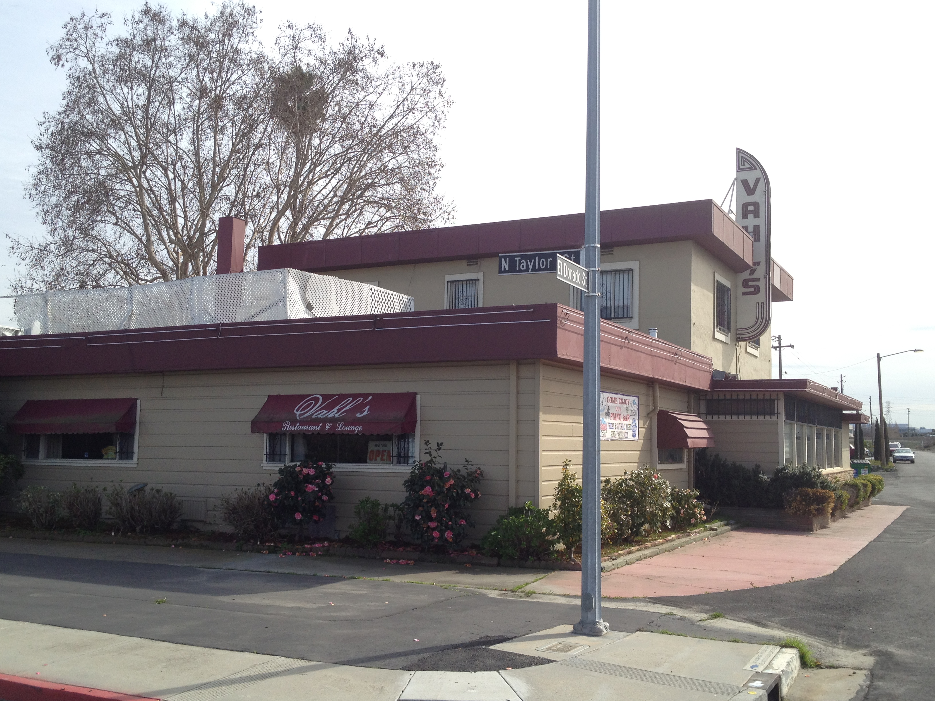 A bit south, along the eastern side of the tracks, lies the historical “Vahl’s Restaurant”. http://www.yelp.com/biz/vahls-restaurant-and-cocktail-lounge-alviso (Eric Carlsen’s write-up: http://www.sanjose.com/underbelly/unbelly/Alviso/vahls.html)
