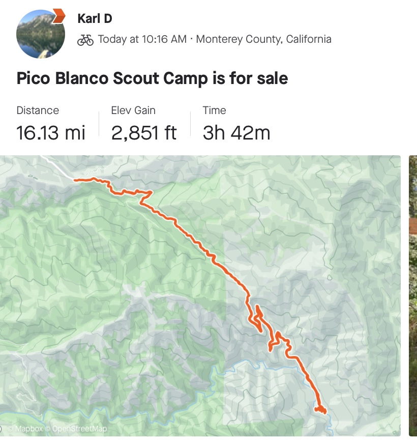copy…”Pico Public Camp” is a USFS campsite on the South Fork reached from the Old Coast Road with egress over El Sur Ranch and Granite Rock property, the BSA camp is on the North Fork.. complete bushwack as Caljim51 noted……cheers