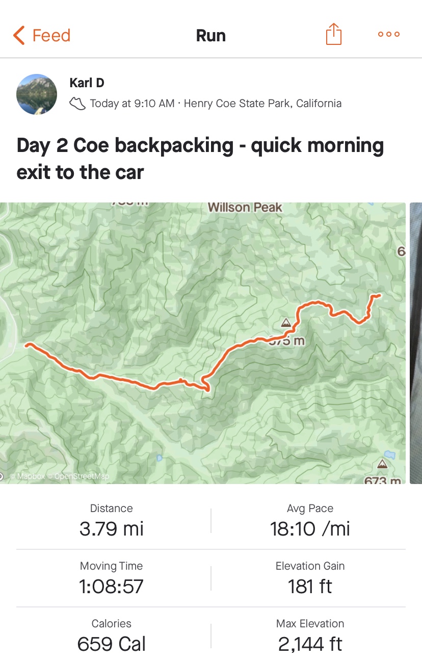 5 miles and 2239 feet, roundtrip, to the Mountain and back to camp. 8 hours slogging time, whereas we had planned on 2 or 3 hours! https://www.strava.com/activities/3829909923