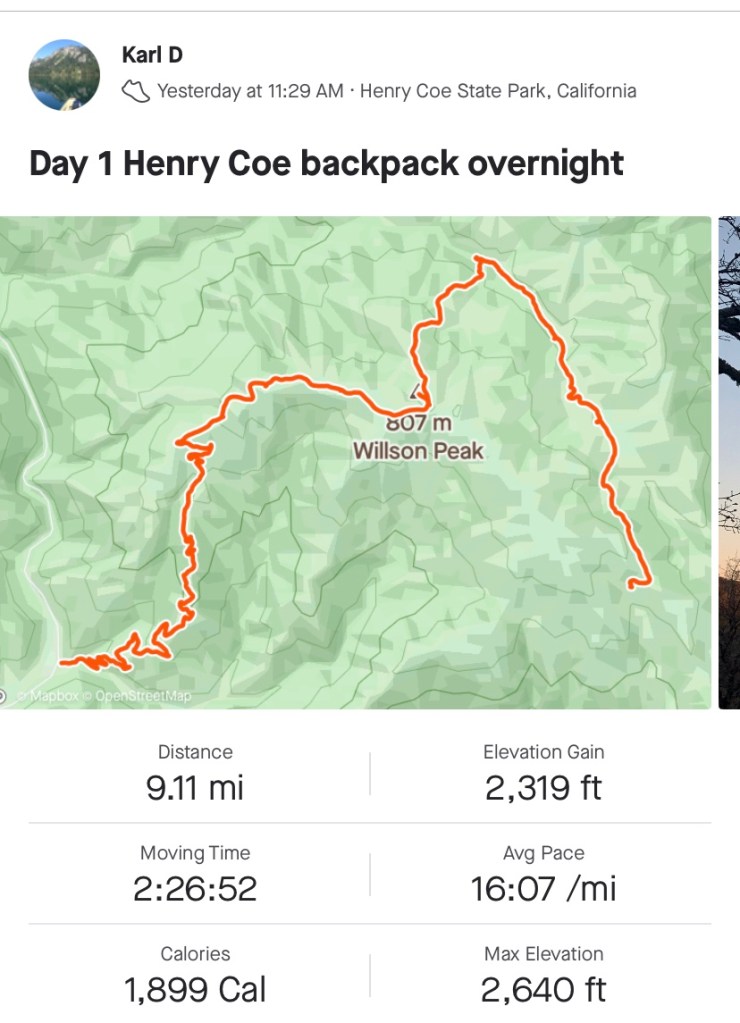 11 miles and 2130 vertical feet to camp, on the first day: https://www.strava.com/activities/3824509689